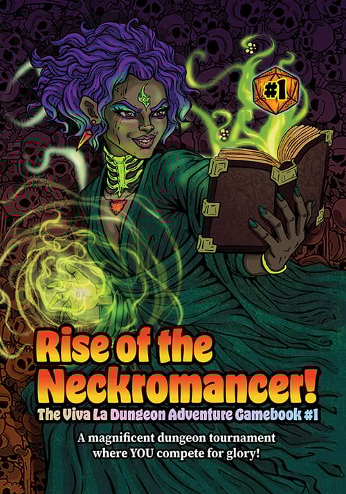 We just hit print on the very first 100 copies of the Viva La Dungeon Adventure Gamebook #1: Rise of the Neckromancer. Check out the awesome original cover art done by Greedmaw! We decided to go color throughout the entire book because it is jammed with Greedmaw’s original art.
